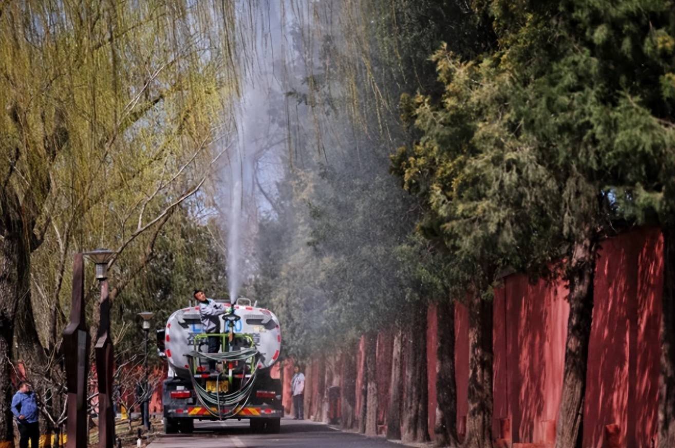 ▲2025年3月19日,北京红领巾公园,工作人员对路侧的圆柏洒水喷淋,以减少花粉飘散量。新京报记者 薛珺 摄