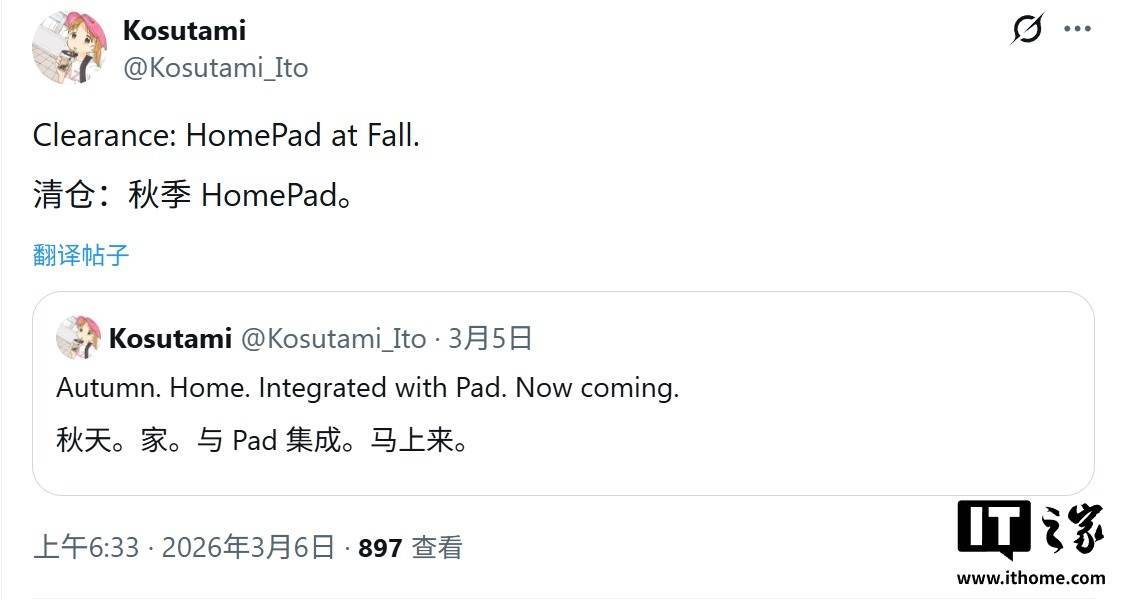 IT之家 3 月 6 日消息,消息源 @Kosutami_Ito 今天(3 月 6 日)在 X 平台发布推文,爆料称苹果公司有望于 2026 年秋季推出智能家居中枢设备(暂称 HomeHub 或 HomePad)。